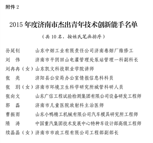 續(xù)晶晶榮獲2015年度濟(jì)南市“杰出青年技術(shù)創(chuàng)新能手”稱號